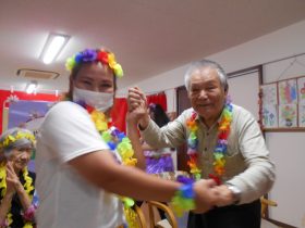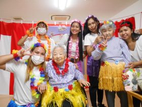 フィリピンとミャンマー出身のスタッフがフラダンスを披露し、一緒に踊られる入居者の皆さまの笑顔がとても印象的でした。