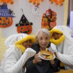 10月、11月で100歳になられるご利用者様のお誕生日を他利用者の皆様、職員でお祝いをしました。長生きの秘訣は「くよくよしない」「前向きな気持ちでいる事」だそうです。ハロウィンの時期には特別な昼食としてパンプキン料理を作り、喜んでいただけました。職員がハロウィン仮装をして記念撮影を行いました。